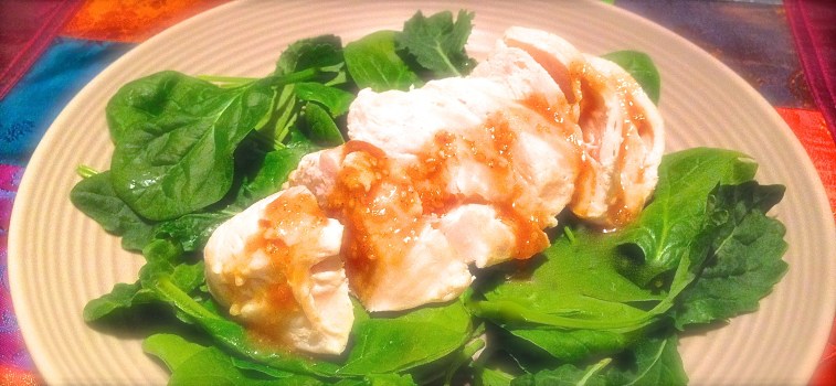I steam the chicken breast with ginger and cooking Sake. Ginger is very nutritious and healthy. It helps our blood flow, helps speed up our metabolism, and blocks the oxidation process in our bodies. Also, ginger is very flavorful and helps rid the meat of its chicken smell.