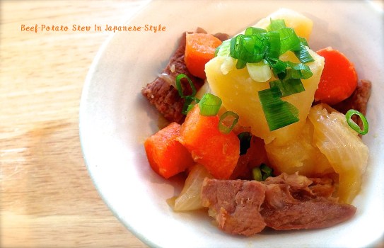 Nikujaga (Japanese style Beef-Potato Stew) is a Japanese simmered dish with a sweet-salty seasoning. It is very popular and everybody likes it.