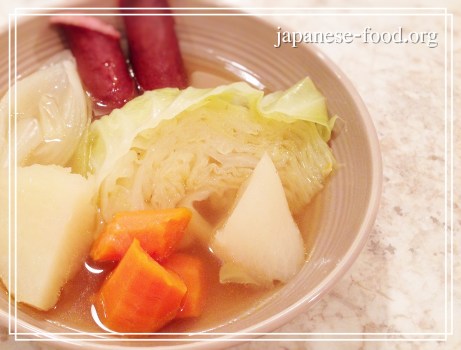 Today I introduce you to my mother’s “Homemade Pot-au-feu” recipe. In Japan, we often cook “Pot-au-feu” because it is very easy and fuss-free. Just cut your favorite vegetables and meat, and simmer in broth. The point is to cut ingredients in large sizes. The dish is simmered for about 40 minutes total so the ingredients are very tender and can be eaten easily. In addition, the soup contains the ingredients’ juices, which means the dish is very nutritious. The only seasonings are salt and pepper so you can enjoy the delicious natural taste of the ingredients.
