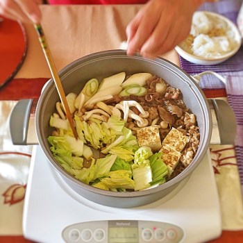 It’s a beef dish, but is unlike American beef dishes. It is a very healthy dish because we use small amounts of very thinly sliced high quality beef and tons of fresh vegetables. It has a savory-sweet taste, so kids who usually don’t like vegetables very much tend to love sukiyaki vegetables.
