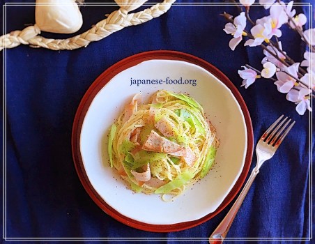 Today I introduce you to Ham and Cabbage Spaghetti. This is very popular dish in spring in Japan. I always cook this for my quick lunch but it is great for dinner too! The seasonings are just pepper and garlic powder so the dish is non-fatty and very delicious!!