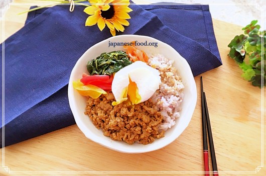 Today I will introduce you to Ginger Chicken Crumble. This is a common recipe in Japan. We usually eat this chicken crumble with rice and sometimes put it in a rice ball. It is also great with salad, pasta and so on. The picture shows my original chicken crumble rice bowl which has sautéed spinach, pickled belle pepper, carrot with sesame dressing and poached egg. It is divine!!