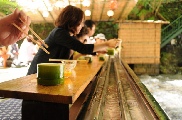 Somen is a Japanese wheat noodle. In Japan, people traditionally eat cold Somen with cold broth in the summer. At some summer events, Somen noodles are placed in a long flume of bamboo with ice cold water. As the somen pass by, people pick them up with chopsticks and dip them in the broth. Somen has been eaten at ceremonial occasions since about 700 years ago.