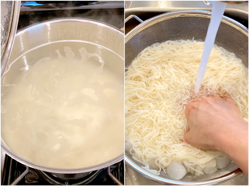 - Drain and cool the noodles by running cold water. Add some ice cubes and scrambling with your fingers to cool each strings. Drain the cold noodles.