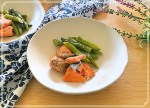 Cook salmon and asparagus in a pan. Season and steam with cooking sake.
